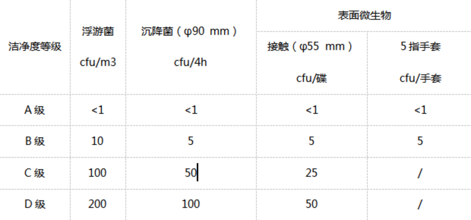 C级和D级用于无菌制剂加工过程中工序规定净化较低的区域。C级静态和动态分別为ISO 7级和ISO 8级。D级静态为ISO 8级。